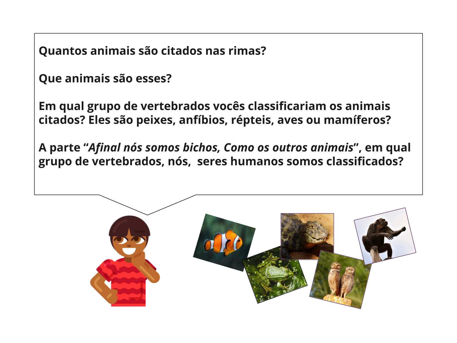Aprenderemos sobre as diferentes classes de animais, como mamíferos, aves, répteis, anfíbios e peixes. Irei falar sobre as características que os definem, como a presença de pelo ou penas, a maneira como respiram, como se alimentam e como se reproduzem. Você vai descobrir como os animais se adaptaram a diferentes habitats, desde as selvas tropicais até o fundo do oceano!